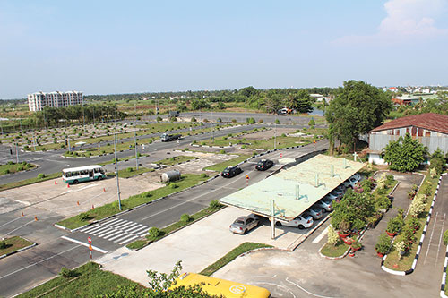 Phần thi thực hành trong hình được tổ chức trên sân sát hạch có phần mềm tự động chấm điểm và lưu trữ điểm.